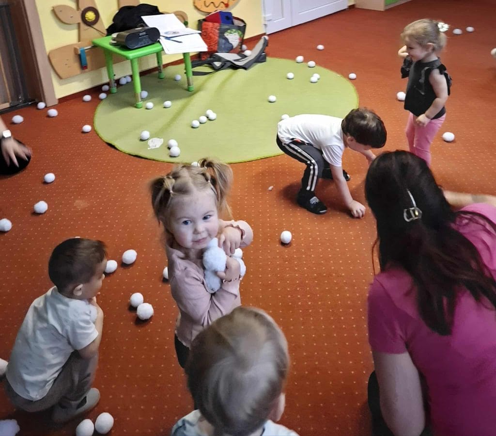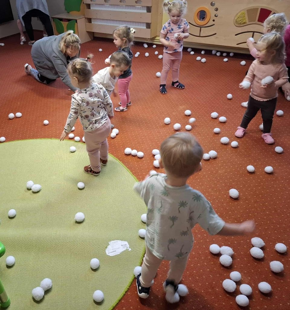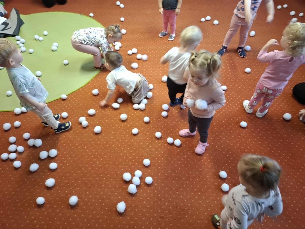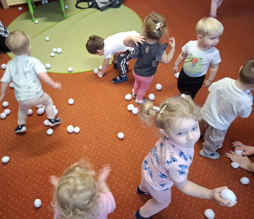 Zajęcia z rytmiki w naszym żłobku pełne ruchu i radości! Dzieci bawiły się „śnieżnymi kulkami”, ćwicząc koordynację, refleks i poczucie rytmu przy muzyce.