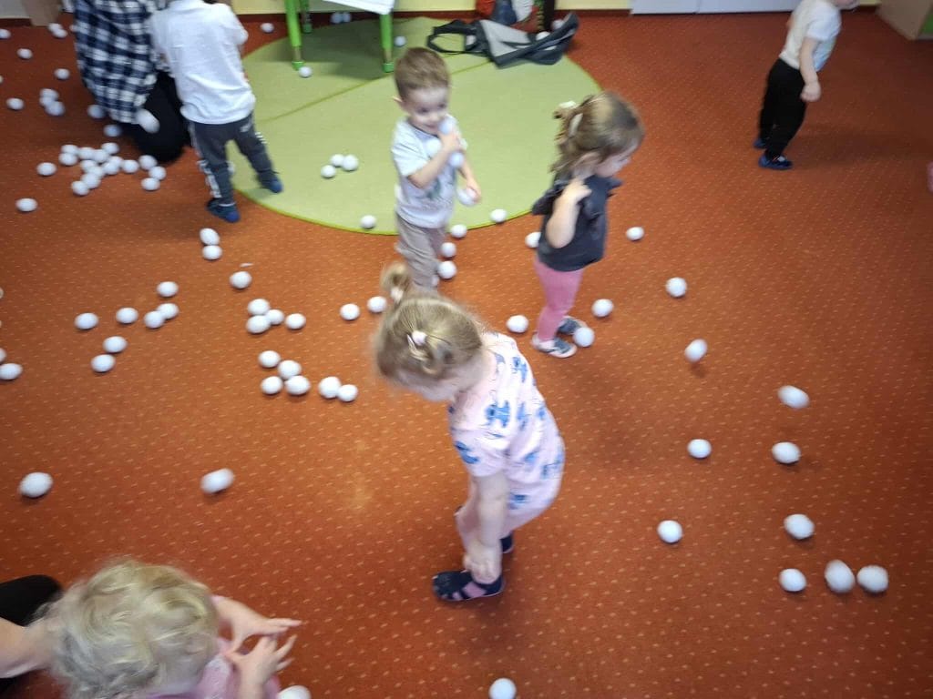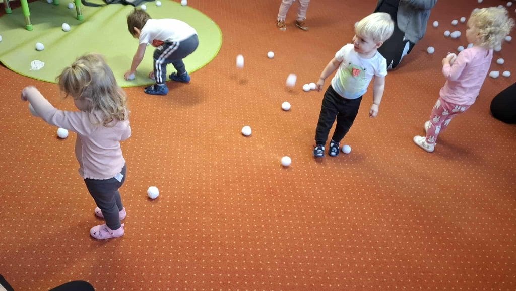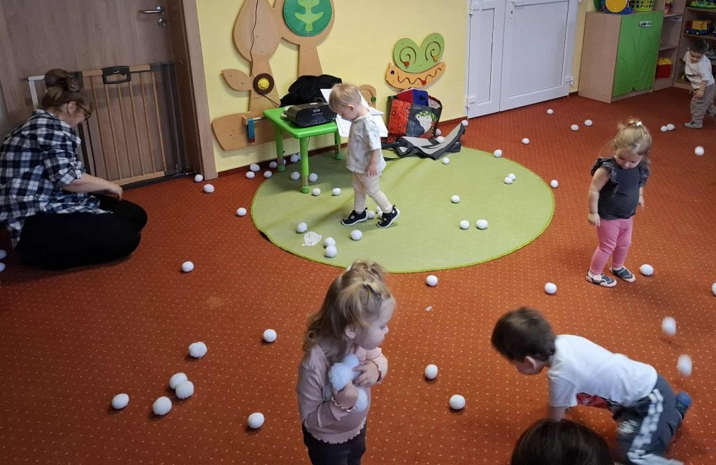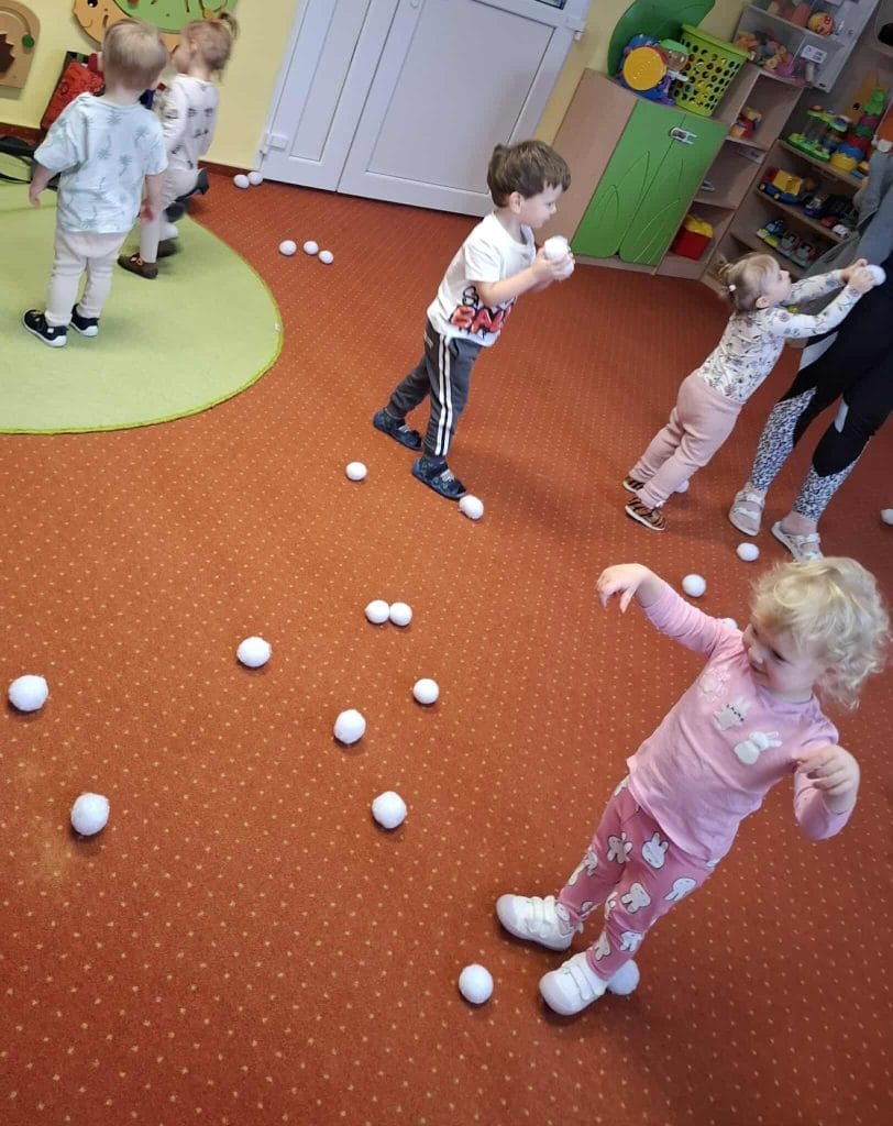 Zajęcia z rytmiki w naszym żłobku pełne ruchu i radości! Dzieci bawiły się „śnieżnymi kulkami”, ćwicząc koordynację, refleks i poczucie rytmu przy muzyce.